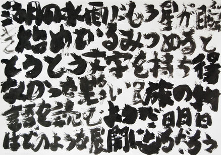 In der aktuellen Arbeit sind die Textvorlagen richtige Gedichte, vielschichtig genug. Es gibt also nichts hinzuzufügen. Das Ereignis/Ergebnis ist die korrekte Abschrift im Mittelformat, der stumme Gedichtvortrag mit Pinsel. Es entstanden Landschaftsbilder aus Schriftzeichen.